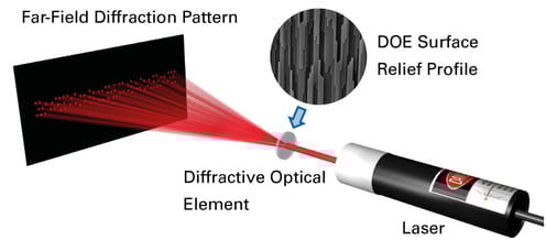さまざまな種類の回折光学素子(ビームスプリッター、パターンジェネレーター、キノフォーム、ビームシェイパー、グレーティング)は、光学機能のために微細構造の表面レリーフプロファイルを利用しています。DOEを通過する光は、回折とその後の伝播によってほぼ任意の分布に再成形できます。DOEは、希望する強度パターンの形状のみをエンコードしますが、入射光源の他のパラメーター(ビームサイズ、発散、偏光など)は維持します。
