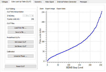 この装置にはGUI(グラフィカルユーザーインターフェース)ベースのコンフィギュレーションマネージャーソフトウェアが付属しています。この設定マネージャーを使用して、幾何学的設定、明るさ、コントラスト、および新しいガンマカーブや別のデジタルドライブ方式を適用することによって電気光学応答を変更できます。これらの高度なキャリブレーションにはUSBインターフェースが使用されます。